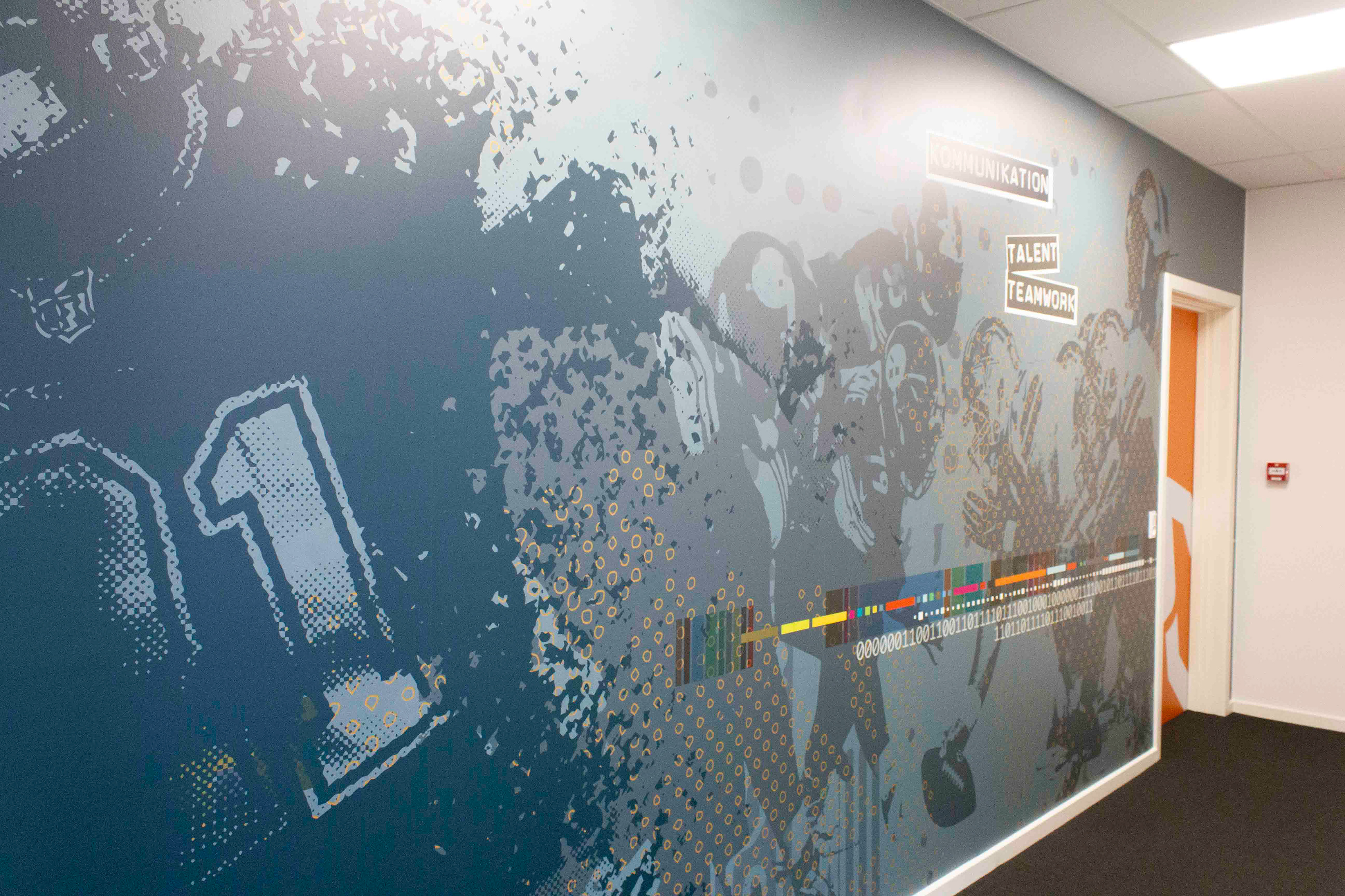 NetIP Aarhus fik liv på væggene og identitet i rummene. Det har jeg løst for dem - i form af en super lang væg med tapet, akustikbilleder i møderum, folieafskærmning på glaspartier, logo med lys, 3D payoff med neonglow, en sjov mand der løber ud af branddøren, en whiteboard-sky til de gode ideer, når man er alene og figur i 3D i møderum.